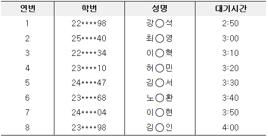 ○ 일 시 : 2026. 3. 26. (목) 15:00~ ○ 장 소 - 대기 : 상상관 4층 로비 - 면접 : 상상관 413호 ○ 준비물: 학생증 ○ 면접자 명단(시간 변경 불가) * 개별 면접이며 면접 시간은 10분 내외입니다.