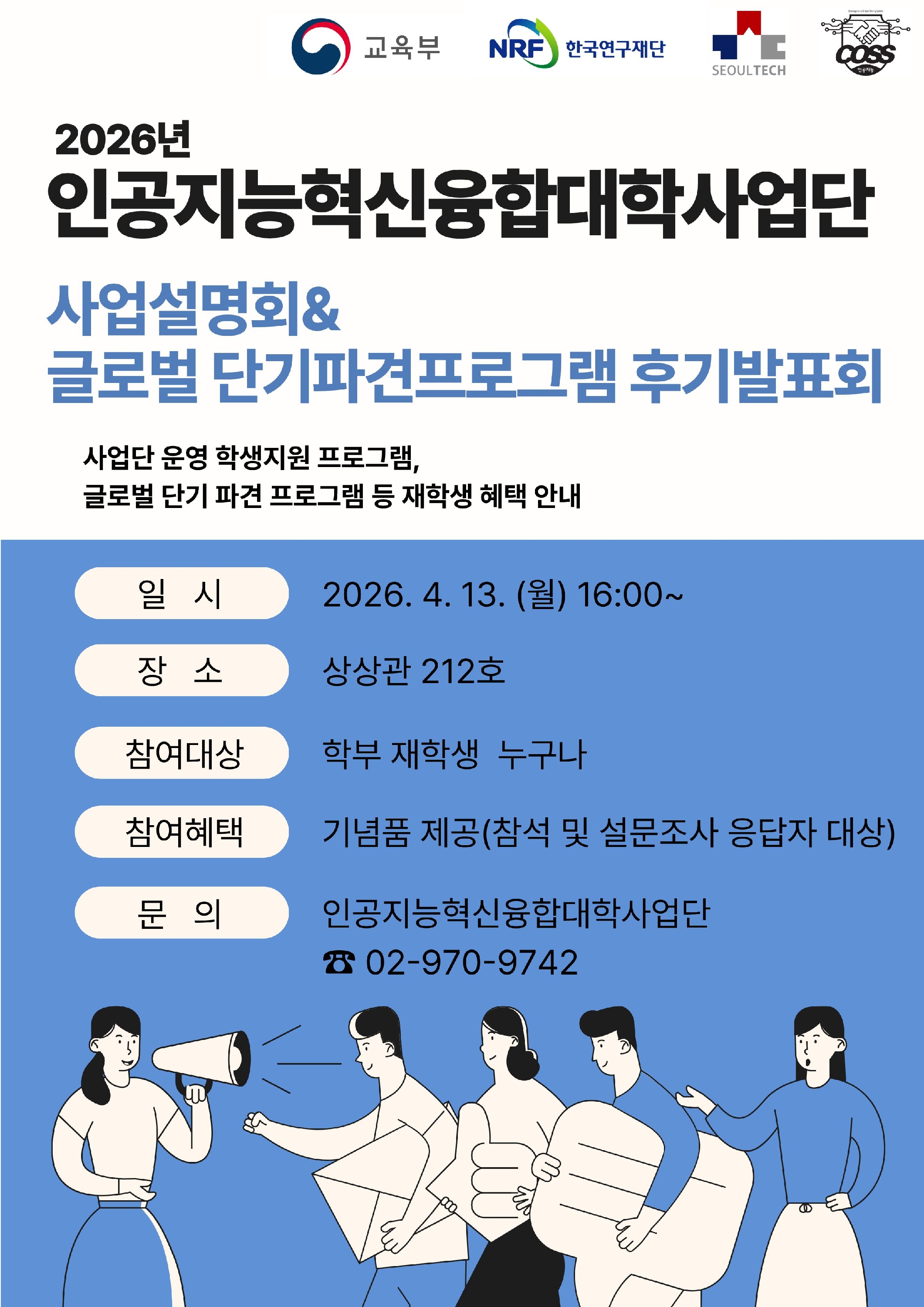 ○ 일 시: 2026. 4. 13. (월) 16:00~ ○ 장 소: 상상관 212호 ○ 참여대상: 학부재학생 누구나 ○ 주요내용 - 사업단 운영 학생지원 프로그램 안내(NVIDIA-SEOULTECH 협력강좌, CO-Week, 챌린지, 해커톤 등) - 글로벌 단기 파견 프로그램(UNLV, THU, UTAS) 선발 안내 - 기 글로벌 단기 파견 프로그램 참가자 후기 발표 ○ 참여혜택: 참석 후 간단한 설문조사 응답 시 기념품 제공 ○ 문 의: 인공지능혁신융합대학사업단 ☎ 02-970-9742